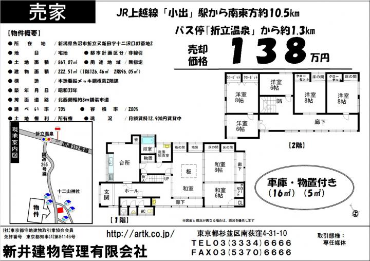 | 所在地 | 魚沼市折立又新田字十二沢口83番地2 8LDK+車庫物置 132万円 |