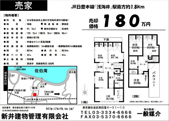 JR日豊本線『浅海井』駅 南方約1.8㎞ | 佐伯市上浦大字浅海井浦3518-1 | 土地/97.76㎡ 建物/133.76㎡(1階74.78㎡ 2階58.98㎡) | 1986-07 | 158.4万円 | 5~ LDK |