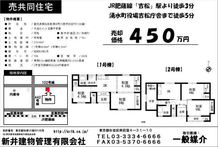 JR庇護線『吉松』駅 徒歩 3分 | 姶良郡湧水町川西字四目竹1136-1 | 土地/273.44 建物/1号棟48.96㎡ 2号棟61.52㎡ | 1985-05 | 450万円 | 3 DK |