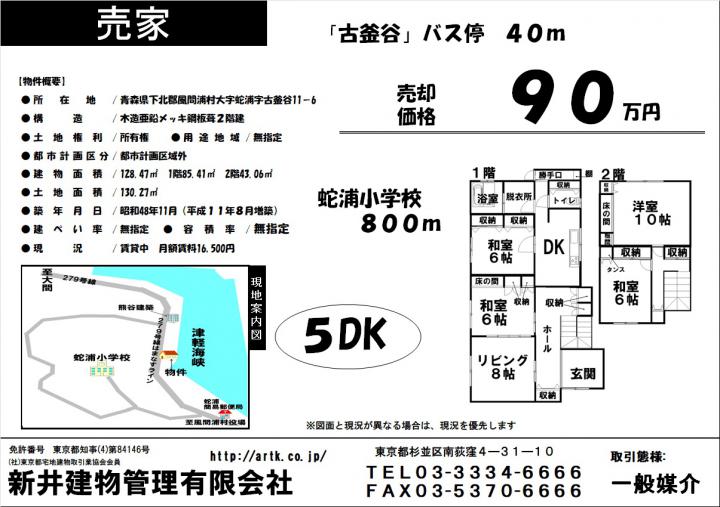| 所在地 | 下北郡風間浦村蛇浦字古釜谷11-6 5DK 90万円 |