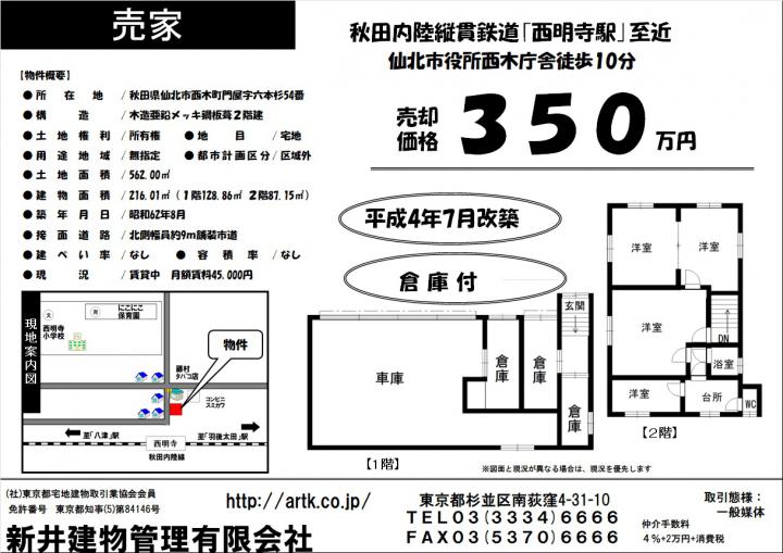 秋田内陸縦貫鉄道『西明寺』駅 徒歩 1分 | 仙北市西木町門屋字六本杉54番 | 土地/562㎡ 建物/216.01㎡(1階128.86㎡/2階87.15㎡) | 1987-08 | 350万円 | 5~ SLDK |