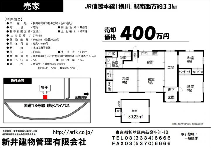 JR信越本線『横川』駅 西方約3.3km | 安中市松井田町入山163番地1 | 土地/575.88㎡ 建物/104.25㎡ | 1987-08 | 400万円 | 3 SDK |