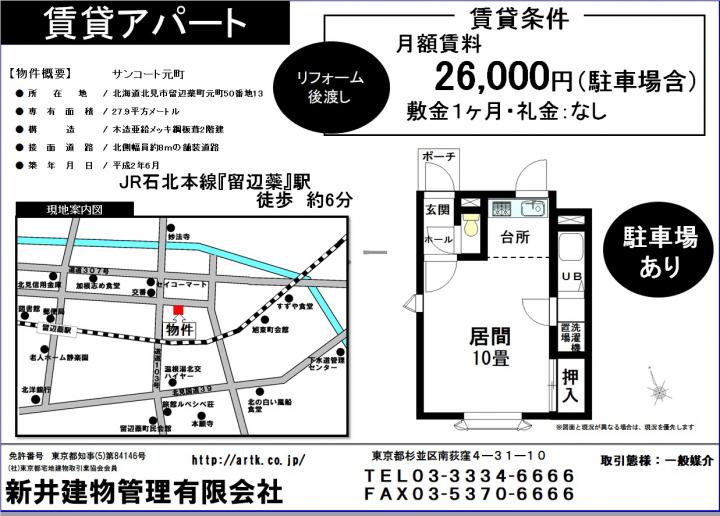 北海道北見市留辺蘂町元町50番地13サンコート元町1K26,000円 26,000円 /管理費等:無 / 1 K JR石北本線「留辺蘂」駅 徒歩 約6分 北海道北見市留辺蘂町元町50番地13サンコート元町1K26,000円 |