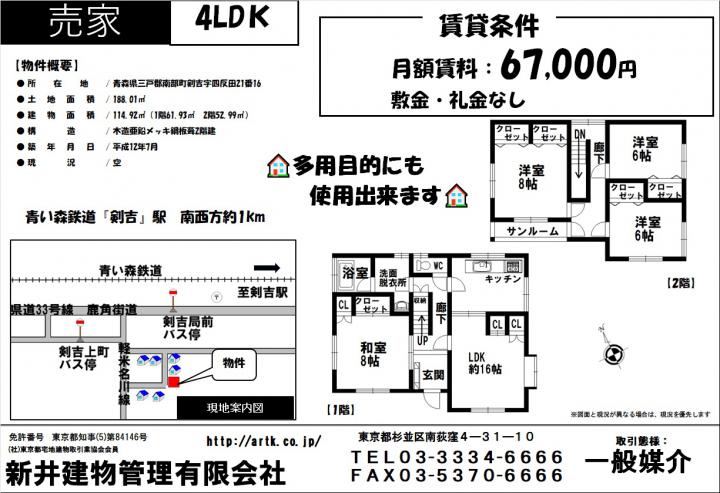 三戸郡南部町剣吉字四反田21番16 4LDK 67,000円 67,000円 /管理費等:なし / 4 LDK 青い森鉄道『剣吉』駅 南西方 約1km 南部バス『剣吉局前』 徒歩 5分 三戸郡南部町剣吉字四反田21番16 4LDK 67,000円 |