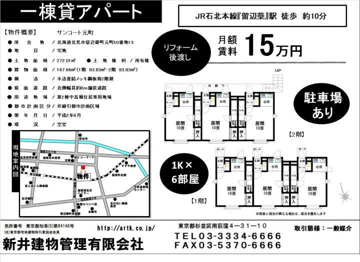 北海道北見市留辺蘂町元町50番地13サンコート元町1棟 15万円 150,000円 /管理費等:無 / 1 K JR石北本線「留辺蘂」駅 徒歩 約6分 北海道北見市留辺蘂町元町50番地13サンコート元町1棟 15万円 |