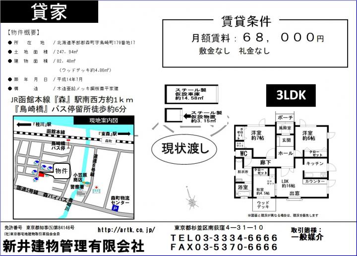 茅部郡森町字鳥崎町179-17 3LDK 68,000円 68,000円 / 3 LDK JR日函館本線「森」南西方約1㎞ バス停「鳥崎橋」徒歩約6分 茅部郡森町字鳥崎町179-17 3LDK 68,000円 |