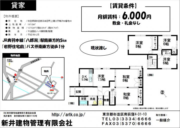 大仙市鑓見内字幕林267-2 6DK 7,100円 7,100円 / 5 DK JR田沢湖線 鑓見内駅 1㎞ 『鑓見内』バス停 徒歩 1分 大仙市鑓見内字幕林267-2 6DK 7,100円 |