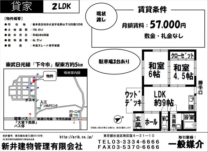 日光市大室字名野山下1830番103号 2LDK 57,000円 57,000円 /管理費等:なし / 2 LDK 東武日光線『下今市』駅 東方約5km 日光市大室字名野山下1830番103号 2LDK 57,000円 |