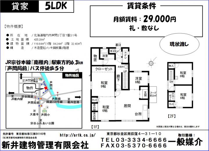 稚内市声問3丁目7番31号 5LDK 29,000円 29,000円 /管理費等:なし / 5 LDK JR宗谷本線『南稚内』駅 東方約6.3km 『声問局前』バス停 徒歩 5分 稚内市声問3丁目7番31号 5LDK 29,000円 |