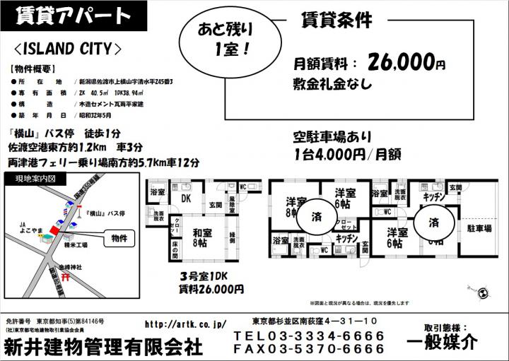 佐渡市上横山245-3 ISLAND CITY 3号室 1DK 26,000円 26,000円 /管理費等:なし / 1 DK 両津港フェリー乗り場 南方約5.7km 車12分 佐渡空港 東方約1.2 車3分 横山バス停 徒歩 1分 佐渡市上横山245-3 ISLAND CITY 3号室 1DK 26,000円 |