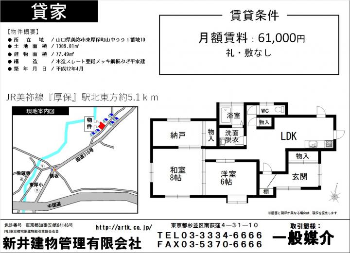 美祢市東厚保町山中991-10 2SLDK 61,000円 61,000円 / 2 LDK JR美祢線『厚保』駅 北東方約5.1km 美祢市東厚保町山中991-10 2SLDK 61,000円 |