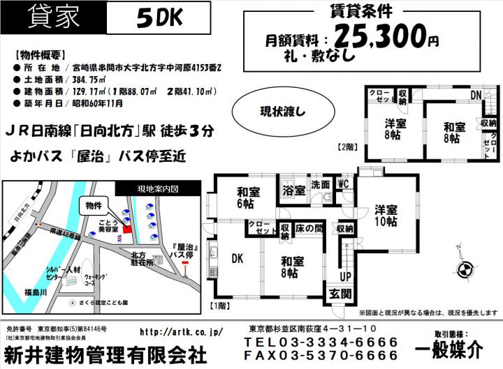 宮崎県串間市大字北方4153-2 5DK 25,300円 25,300円 /管理費等:なし / 5 DK JR日南線『日向北方』駅 西方 徒歩 3分 よかバス『屋治』バス停 徒歩 3分 宮崎県串間市大字北方4153-2 5DK 25,300円 |