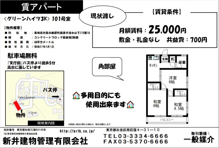 | 物件名 | 対馬市厳原町西里113-10グリーンハイツ101 3K 25,000円 |