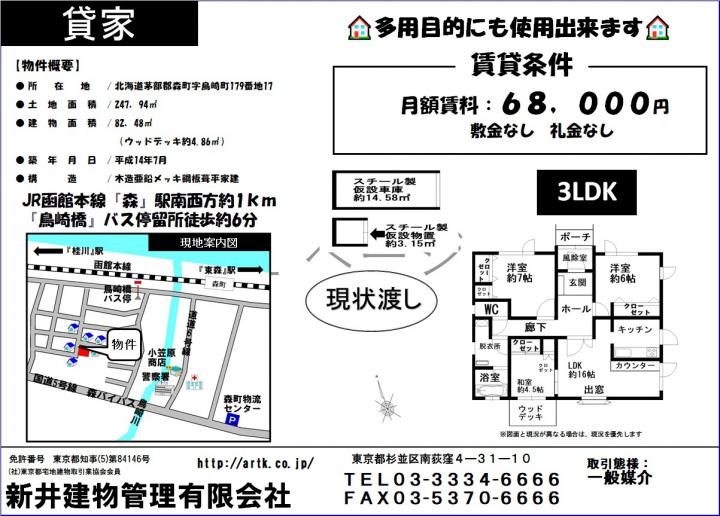 JR日函館本線「森」南西方約1㎞ バス停「鳥崎橋」徒歩約6分 | 茅部郡森町字鳥崎町179-17 |
