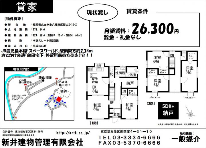 【 一戸建て 】北九州市八幡東区勝山2-10-2 5SDK 26,300円 【物件概要】 ● 所在地/ 福岡県北九州市八幡東区勝山2-10-2 ● 地目/ 宅地 ● 用途地域/ 無指定 ● 土地面積/ 178.64㎡ ● 都市計画区分 / 市街化調整区域 ● 建物面積/ 123.82㎡(1階69.17㎡・2階54.65㎡) ● 構造/ 木造スレート葺2階建 ● 築年月日/ 平成3年6月 ● 接面道路/ 南西側幅員1.5~2mコンクリート舗装階段私道と ● 土地権利/ 所有権 ● 現況/ 空