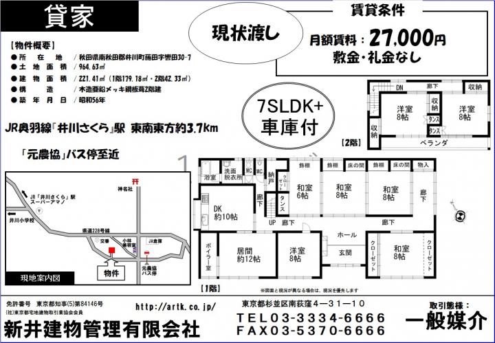 | 物件名 | 南秋田郡井川町葹田字轡田30-7 7SLDK+車庫付 27,000円 |