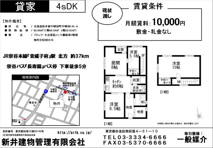 宗谷バス『長寿園』 バス停 南東方 徒歩約6分 | 枝幸郡中頓別町中頓別145-6 | 3 LDK | 約96.96㎡(1階約68.04㎡ 2階28.92㎡) | 10,000円 | なし なし |