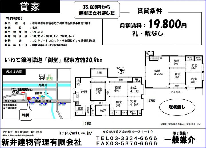| 物件名 | 岩手郡葛巻町江刈第14地割字小苗代95番7 10SLDK 12,000円 |