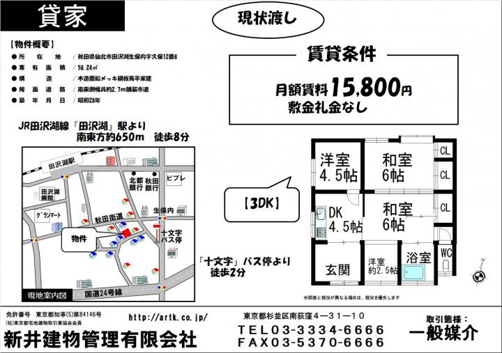 | 物件名 | 仙北市田沢湖生保内字久保 3DK 15,800円 |