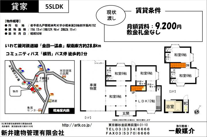 コミュニティバス『横羽』 徒歩 1分 | 九戸郡軽米町大字小軽米第24地割字莇内152 | 5 LDK | 158.13㎡(1階129.98㎡ 2階28.15㎡) | 2003年11月 | 6,100円 | なし なし |