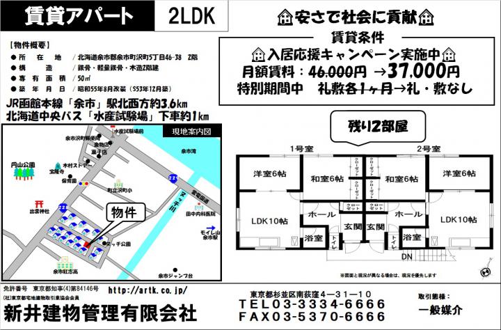 | 物件名 | 余市郡余市町沢町5丁目46-38 2階1・2号室 37,000円 |