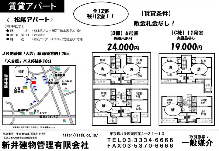 JR肥薩線『人吉』駅 南東方約1.7km | 人吉市西間下町字高見753-3 松尾アパートC棟11号室 | 1 LDK | 30.8㎡ | 1965年12月 | 19,000円 なし | なし なし |
