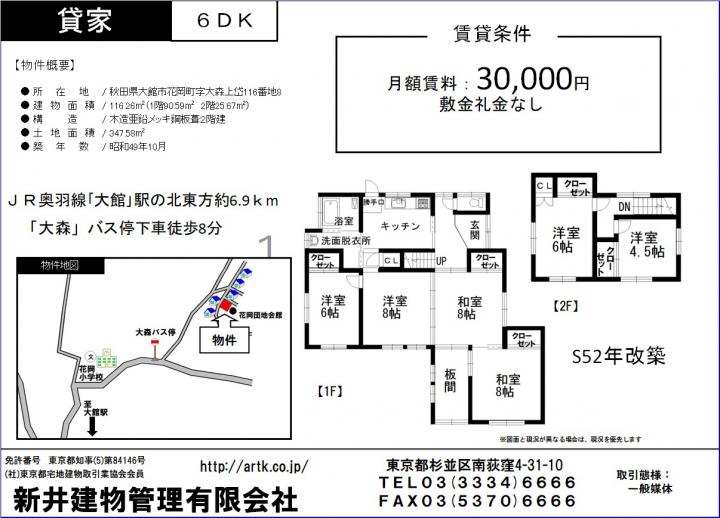 | 物件名 | 大館市花岡町字大森上岱116番地8 6DK 30,000円 |
