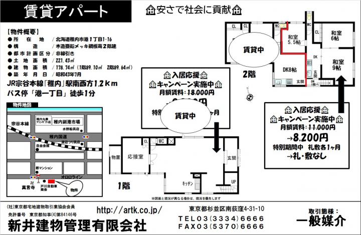 JR宗谷本線『稚内』駅 南西方約1.2km | 稚内市湊1丁目1-16 B棟 | 2 DK | 44.64㎡ | 1968年07月 | 8,200円 なし | なし なし |