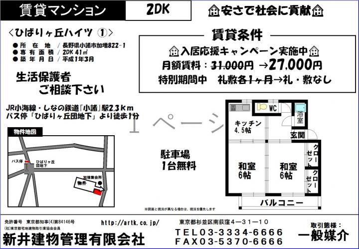 | 物件名 | 小諸市加増822-1 ひばりヶ丘ハイツ①102号室 2DK 19,000円 |