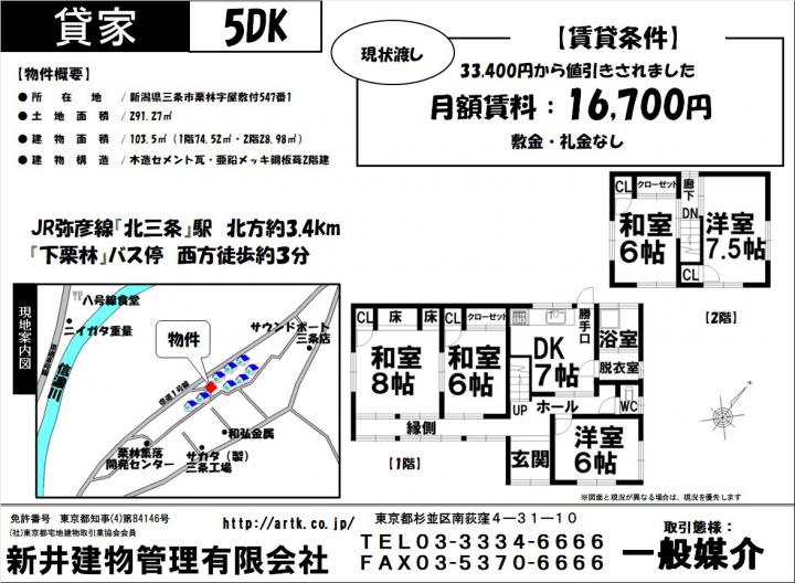 | 物件名 | 三条市栗林字屋敷付547-1 5DK 9,800円 |