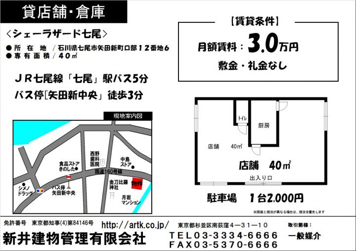 JR七尾線『七尾駅』バス5分 | 七尾市矢田新町ロ部12番地6 | 40㎡ | 30,000円 無 | 無 無 |