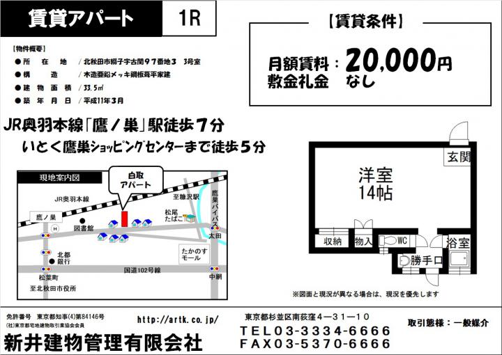 JR奥羽本線『鷹ノ巣』駅 徒歩 7分 | 北秋田市綴子字古関97-3 カメリア館3号室(旧第3白取アパート) | 1 DK | 33.5㎡ | 1999年03月 | 22,000円 無 | 無 無 |