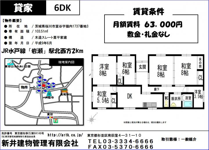 | 物件名 | 茨城県桜川市富谷字猫内1737番地3 6DK 63,000円 |