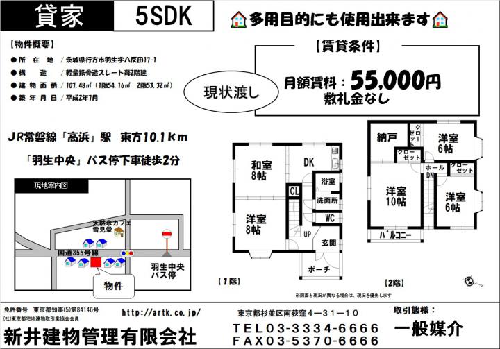 JR常磐線 『高浜』駅 東方約10.1km | 行方市羽生字八反田17-1 | 5 SDK | 107.48㎡(1階54.16㎡2階53.32㎡) | 1990年07月 | 55,000円 なし | なし なし |