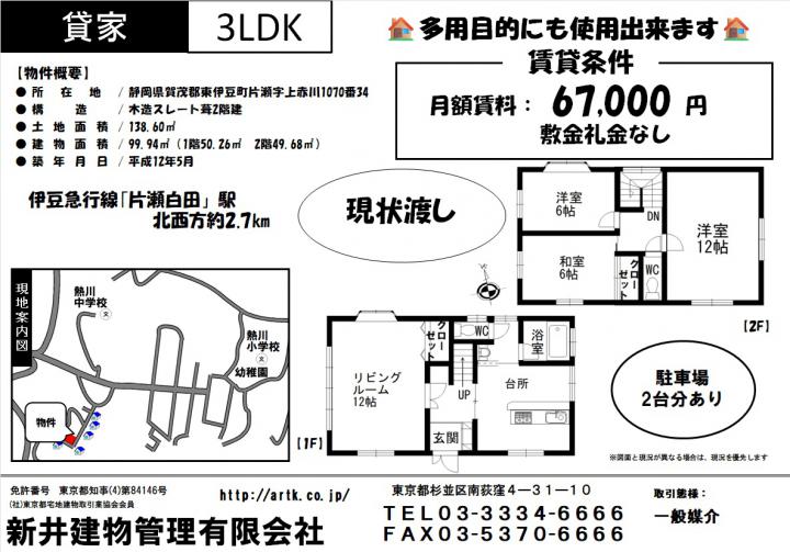 伊豆急行『片瀬白田』駅 北西方約2.7km | 賀茂郡東伊豆町片瀬字上赤川1070-34 | 3 LDK | 99.94㎡(1階50.26㎡ 2階49.68㎡) | 2000年05月 | 67,000円 | なし なし |
