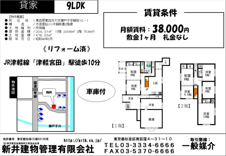 | 物件名 | 青森市大字瀬戸子字磯田10-1 9LDK 23,100円 |