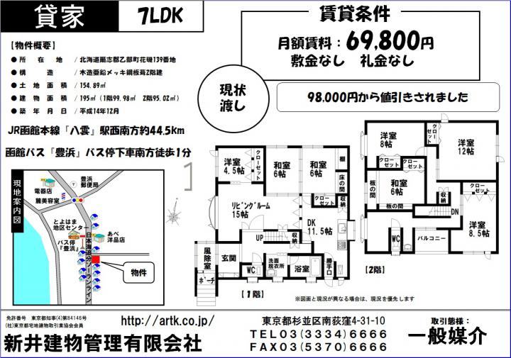 | 物件名 | 爾志郡乙部町花磯139番地 7LDK 23,100円 |