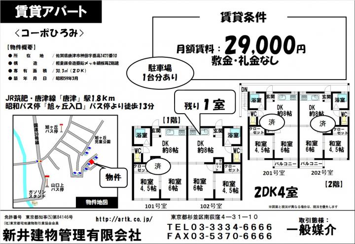 | 物件名 | 唐津市神田字岳高1471-10 コーポひろみ102号室 2DK 29,000円 |