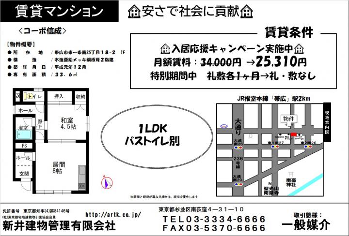 | 物件名 | 帯広市東一条南25丁目18-2 コーポ信成 1階 1LDK25,310円 |