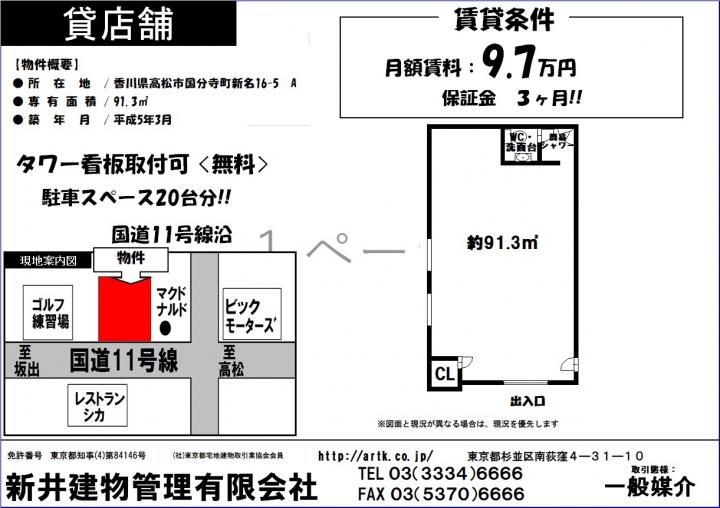 | 物件名 | 高松市国分寺町新名16-5 貸店舗A 9.7万円 |