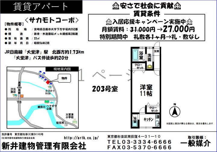 | 物件名 | 日南市大字下方552番地 サカモトコーポ1DK 203 27,000円 |