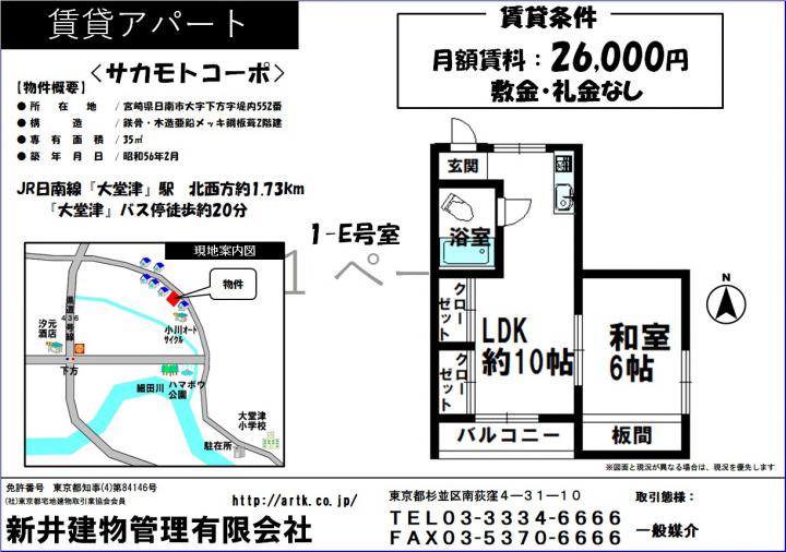 | 物件名 | 日南市大字下方552番地 サカモトコーポ1DK 1-E 26,000円 |