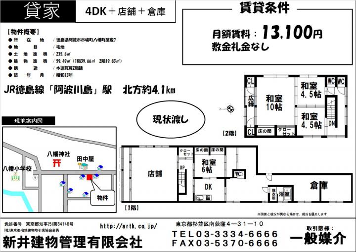 JR徳島線『阿波川島』駅 北方約4.1km | 阿波市市場町八幡町屋敷7 | 59.49㎡(1階39.66㎡ 2階19.83㎡) | 1938年01月 | 13,100円 なし | なし なし |