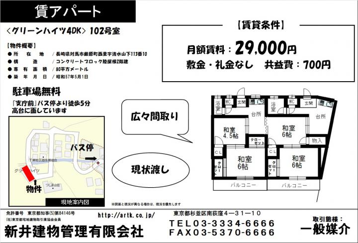 | 物件名 | 対馬市厳原町西里113-10グリーンハイツ102-103号室 4DK 29,000円 |