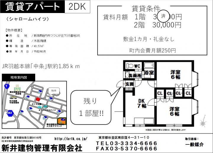 | 物件名 | 胎内市つつじヶ丘下315-285 シャロームハイツ 201 2DK 29,800円 |