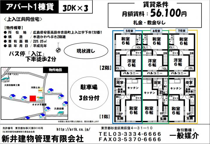| 物件名 | 安芸高田市吉田町上入江字下市130番1 1棟貸 3DK×3 56,100円 |