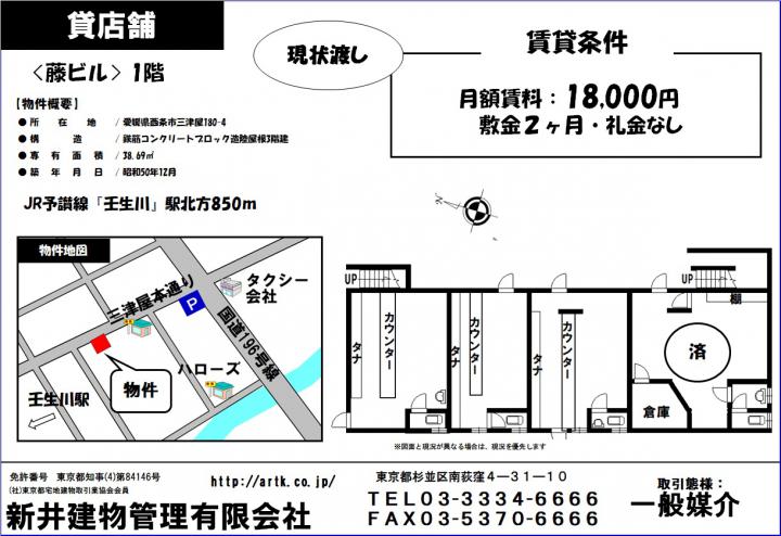 | 物件名 | 西条市三津屋180-4 藤ビル1F 1-3 18,000円 |