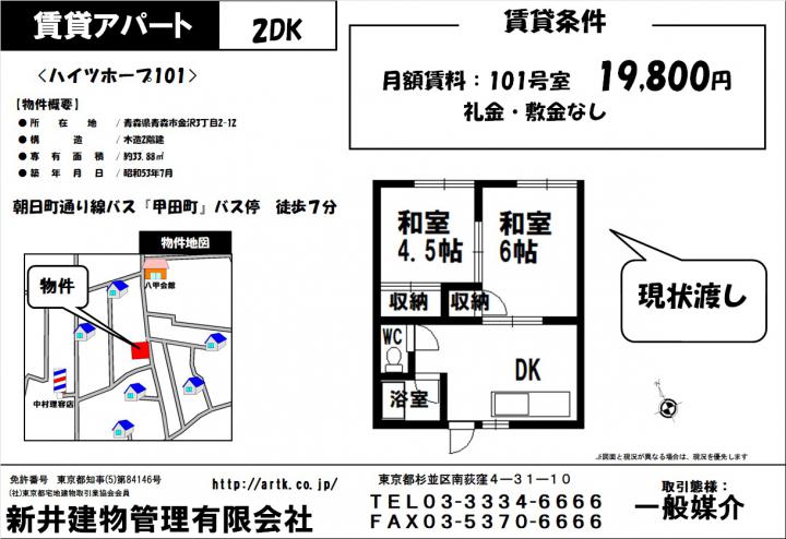 | 物件名 | 青森市金沢3丁目2-12 ハイツホープ101号室 2DK 19,800円 現状渡し |