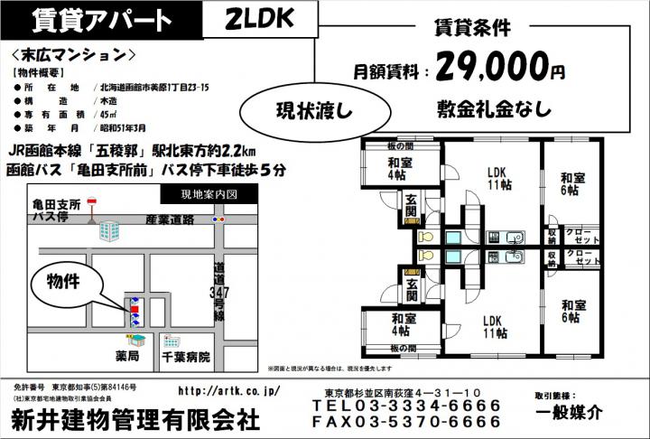 【賃貸物件】函館市美原1丁目23-15 末広マンション 2LDK 29,000円(アパート)|JR函館線『五稜郭』駅 北東方約2.2km|新井建物管理|全国の不動産、収益物件、中古住宅、賃貸・売買物件