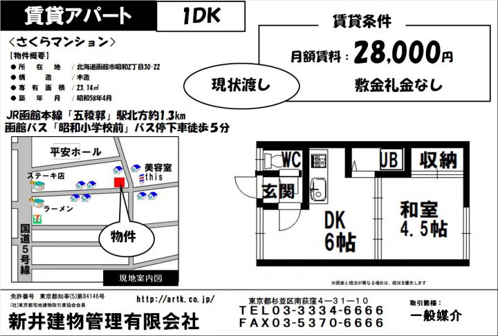 | 物件名 | 函館市昭和2丁目30-22 さくらマンション 1DK 28,000円 |